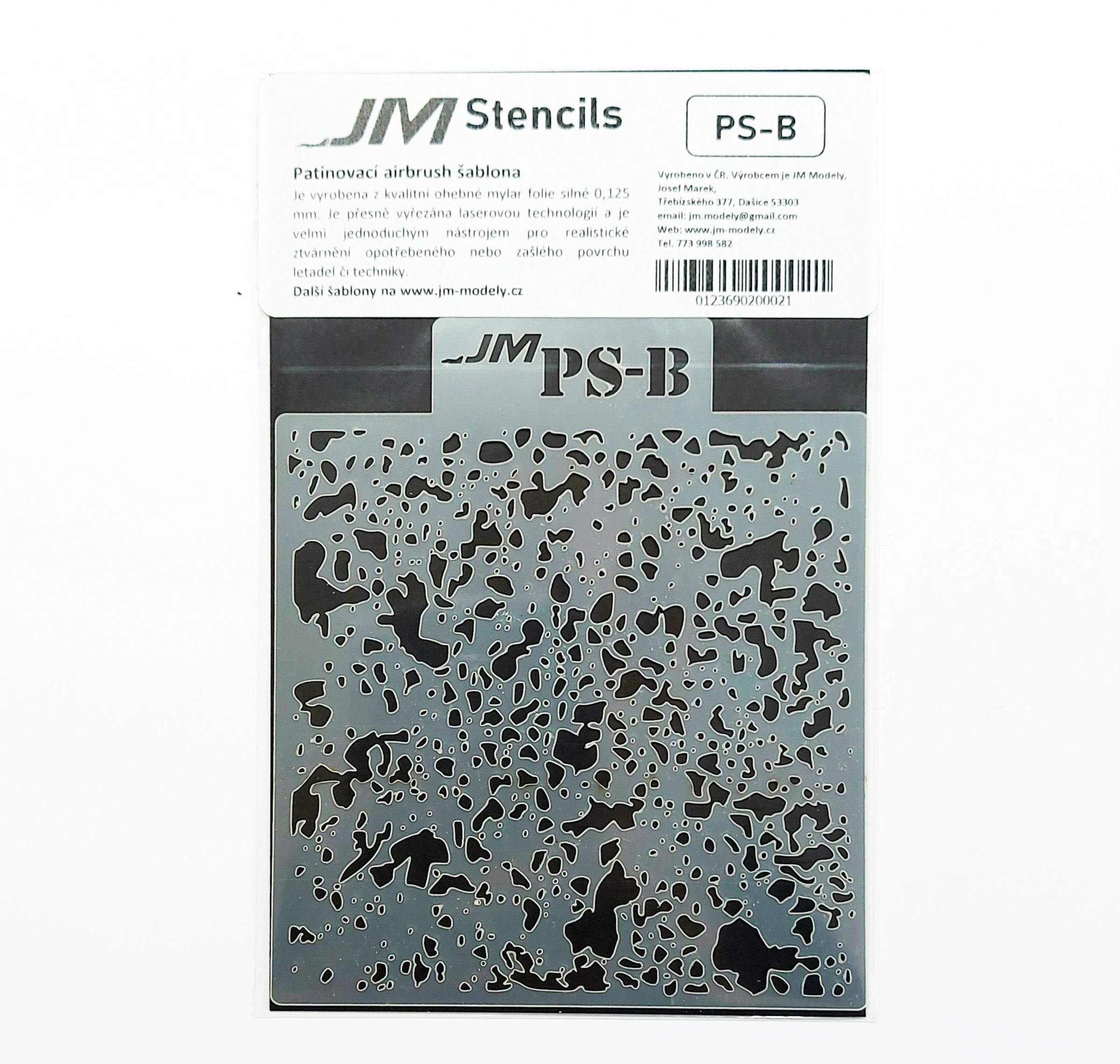 Stříkací patinovací šablona z kvalitní 0,125mm silné plastové folie pro dokonalé provedení zašlého povrchu letadla, nebo vojenské techniky. Je přesně vyřezána laserovou technologií.